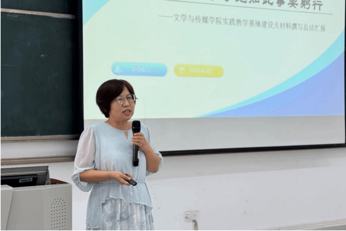 文学与传媒学院副院长周凤玲教授在会上作实践教学基地建设经验分享。她指出,学院通过三年分阶段建设基地,形成“服务国家战略-深融专业课程-师生协同创新”的特色模式。她提出基地建设材料撰写应立足实践成果、强化过程总结、彰显育人特色,并引用朱熹“问渠那得清如许?为有源头活水来”,阐释实践在教学创新中的源头作用。