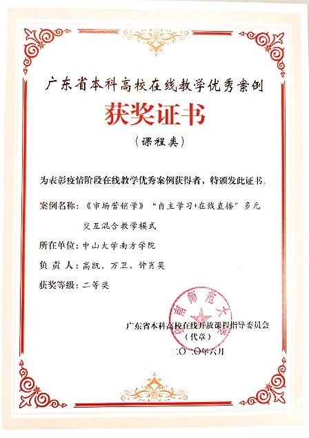 《市场营销学》课程于2019年通过广东省教育厅验收,被认定为省级精品资源共享课,在课程建设期间使用教育信息技术建立了课程网站(http://39.108.92.95/scyx/),开发了较为完备的网络资源,满足学生随时随地的学习需求,同时开放课程网站资源实现了校内外共享。此外,课程团队用心将思政要素融入课程教学中,构建以“课程知识”、“营销能力”和“职业素养”为基本内涵的课程赋型机制,培养学生的知识应用能力、职业素养和道德品质,帮助学生在学习理论知识的同时,树立文化自信、家国情怀和正确的价值观。2020年7月荣获广东省本科高校在线教学优秀案例(课程类)二等奖。