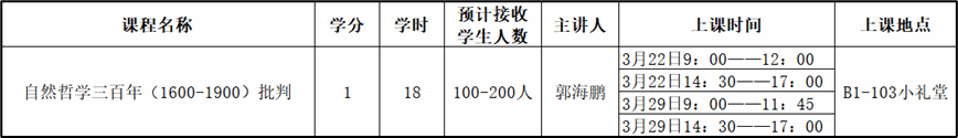 博雅学院将于3月22日和3月29日,邀请郭海鹏教授作为主讲,开设学术报告型公选课《自然哲学三百年(1600-1900)批判》。公选课1学分,可接收100至200名同学报名。上课具体安排如下表: